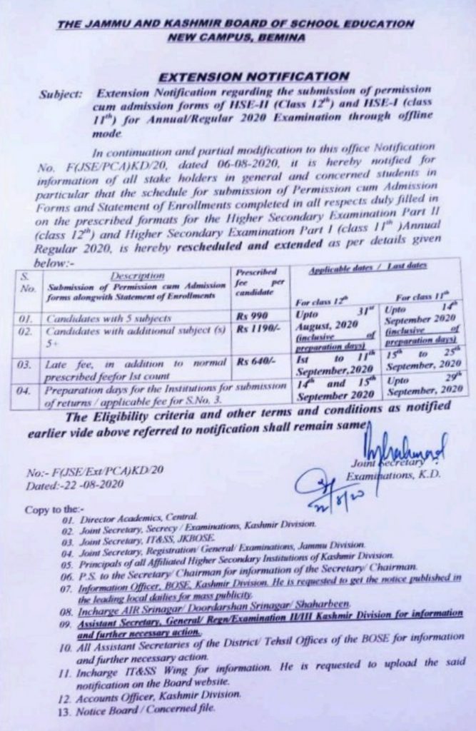 In continuation and partial modification in the office Notificattion No F(JSE/PCA)KD/20, dated 06-08-2020, it as hereby notified for information of all stake holders in general and concerned students in particular that the schedule for submission af Permission cum Admission Forms and Statement of Enrollments completed in all respects duly filled in the prescribed formats for the Higher Secondary Examination Part-II (class 12th) and Higher Secandary examination Part-I (Class 11th) Annual Regular 2020, is hereby rescheduled and extended as per details given below: