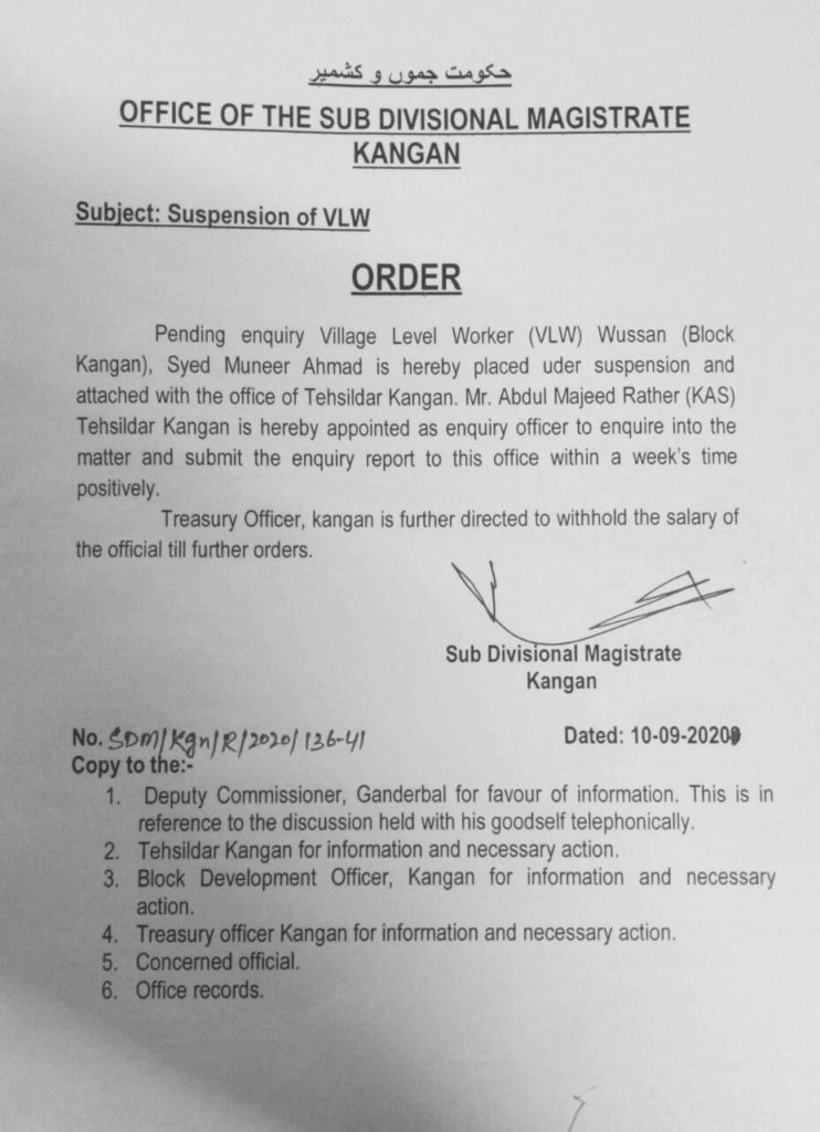 An order was today issued by SDM Kangan which says the VLW Wussan Syed Muneer is placed under suspension and attached with the office of tehsildar Kangan.