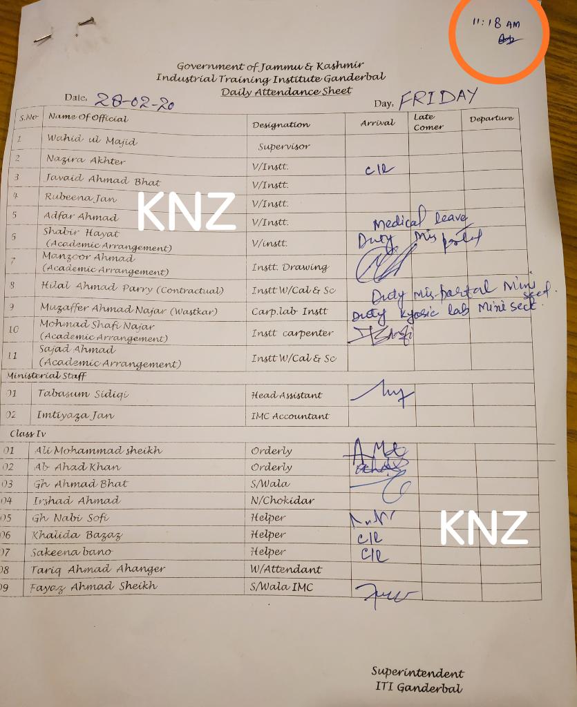 When Kashmir News Zone-KNZ team reached the office at 11:18 AM (Mention on Photo) the reporter found several employees absent.
